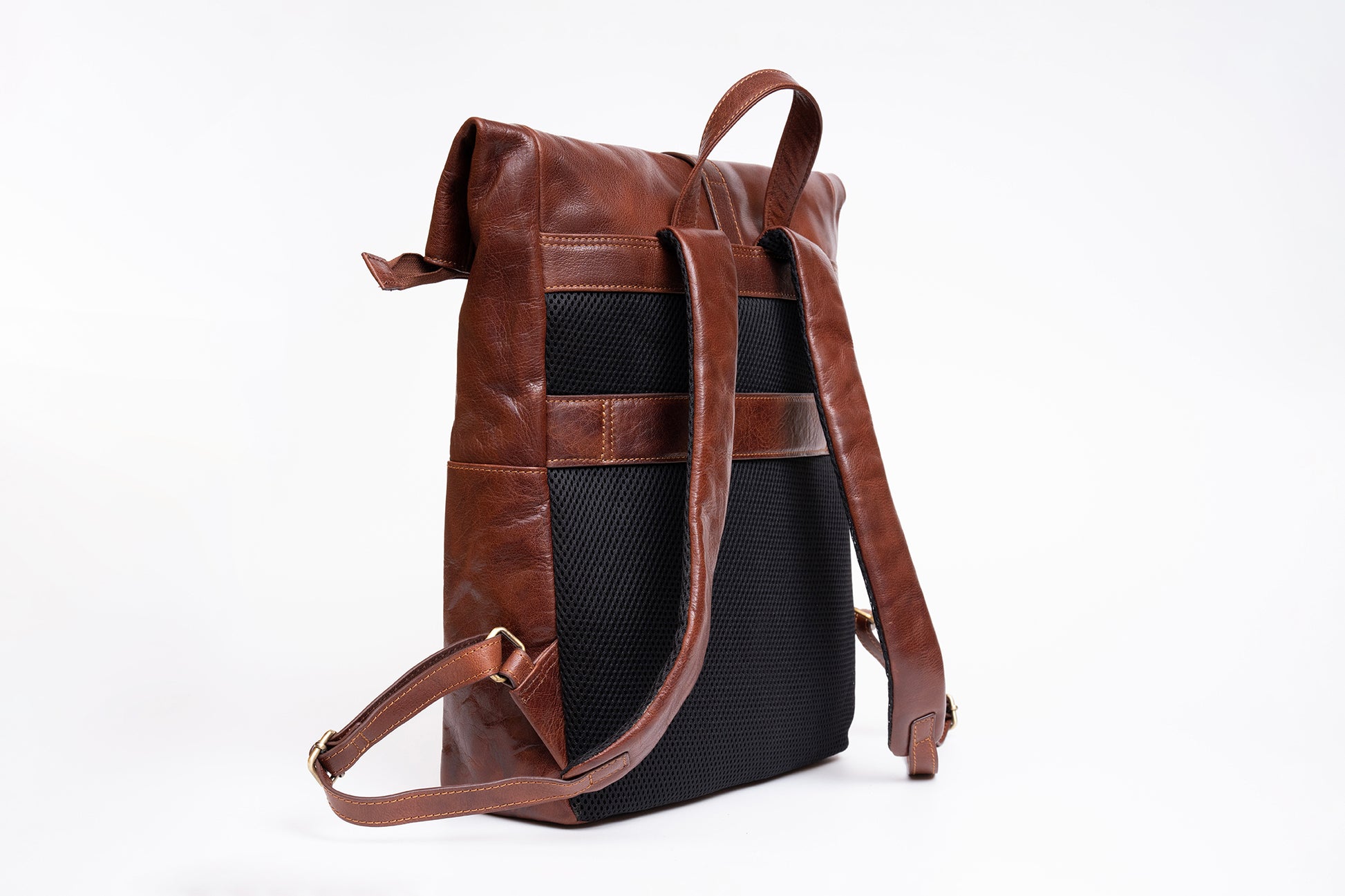 - Rich, Distressed Finish: The leather has a distinctive pull-up or distressed appearance that highlights natural markings and variances, giving the backpack a rugged, classic appeal.